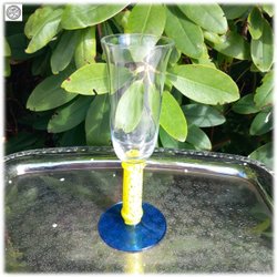 Prachtig Åhléns mondgeblazen witte wijnglas op geelblauwe voet. Mooie staat.
