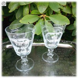 Prachtig paar wijnglazen op voet met witte tekst van verschillende wijnsoorten. Mooie staat.