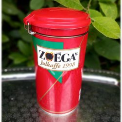 Mooie Zoega julkaffe 1998 rode cilindervormige koffieblik. Mooie staat