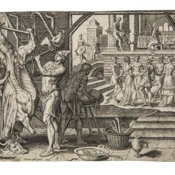 Het slachten van het gemeste kalf - Maarten van Heemskerck (na) - Kopergravure