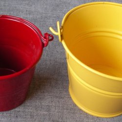 Zeer mooie blikken emmers/bloempotten gele matte lak + wijnrode glanzende lak