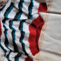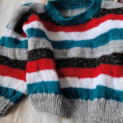 Wit, turquoise, zwart, rode trui