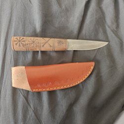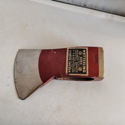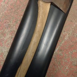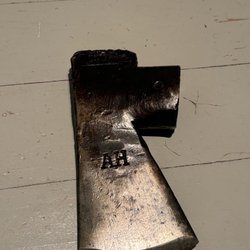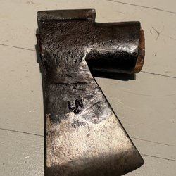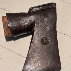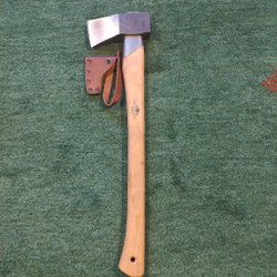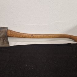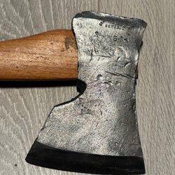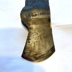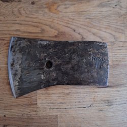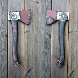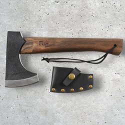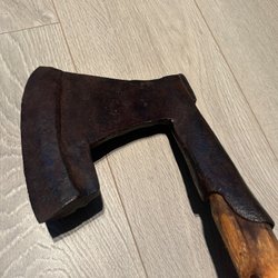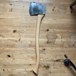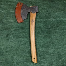 Gerestaureerde bijl met lasergeëtst ontwerp. Nieuwe essenhouten steel en nieuwe lederen bescherming!