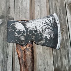 Gerestaureerde bijl met lasergeëtst ontwerp. Nieuwe handgemaakte steel en nieuwe lederen bescherming