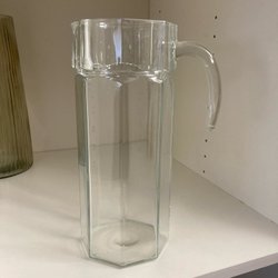 Blauwe glazen kan met groen handvat