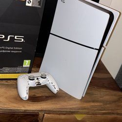 Playstation 5 skin edition med två handkontroller samt ladddocka.