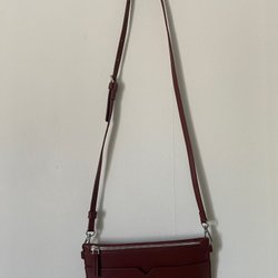 Beige tygväska med blåa detaljer och bruna handtag. Väskan har ett fack på utsidan och stängs med en tryckknapp.