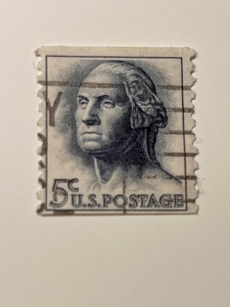 Säljer ett klassiskt frimärke från USA: George Washington 5 cent, utgivet 1932–1938.