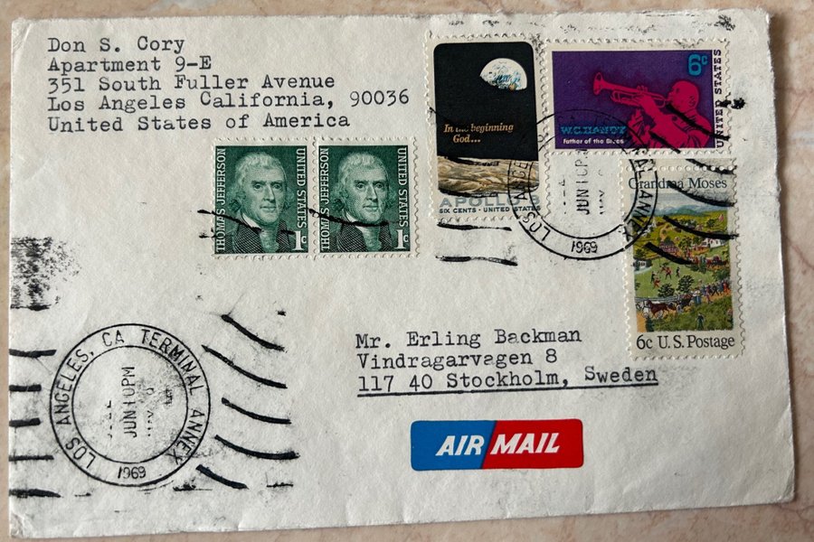 ett flygpostkuvert skickat från Los Angeles, Kalifornien, USA, till Stockholm, Sverige, poststämplat den 10 juni 1969.