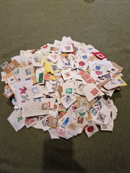 Osorterade urklippta frimärken från varierande länder. Ca 430g.