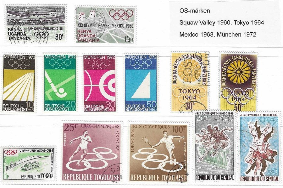 Lot märken för OS 1960 Squaw Valley, 1964 Tokyo, 1968 Mexiko, 1972 Munchen