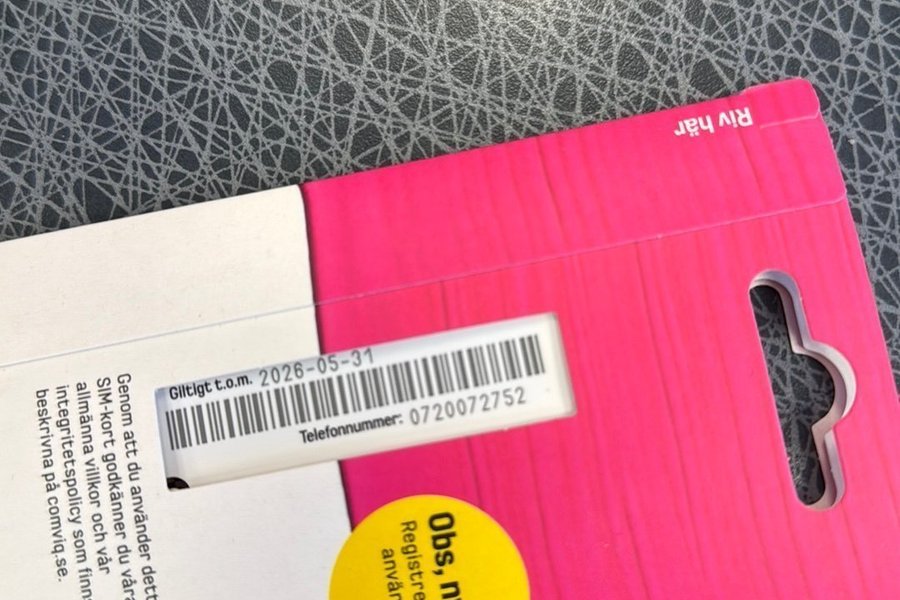 Comviq SIM-kort. Giltigt t.o.m. 2026-05-31. Telefonnummer: 0720072752. Registrera innan användning.