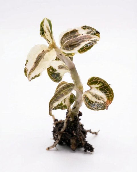 Anoectochilus roxburghii variegata är en ovanlig och mycket eftertraktad juvelorkidé, uppskattad främst för sina blad snarare än sina blommor. Den tillhör släktet Anoectochilus, som är känt för sina sammetslika blad med lysande nerver – ofta kallade “jewel orchids”.