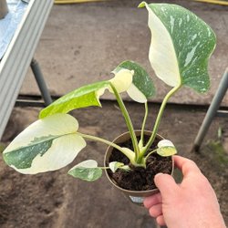 Monstera Thai Constellation med variegerade blad. Växten har flera blad med distinkta mönster i olika nyanser av grönt och gräddvitt. Den står i en kruka med jord.