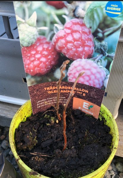Nyss uppgrävda rotskott från mamma plantan. Sorten 'Glen Ample' är en lättodlad med attraktiva, röda, fasta och supersöta bär. Sorten är härdig i zon 3 ( och säkert högre). Jag har den i kruka och den övervintrar fint.