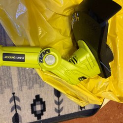 Ryobi grästrimmer för trädgårdsarbete. Modellen är batteridriven och har ett justerbart handtag för bekväm användning. Den är lämplig för att trimma gräskanter och svåråtkomliga områden.