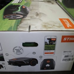 Robotgräsklippare av märket Robomow. Gräsklipparen är grön och svart. Linjetråd medföljer. Ansluts med app