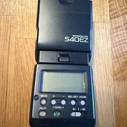 Tre kamerablixtar. En National PE-2006 med originalkartong, en Ricoh Speedlite 200 med fodral och en Sunpak auto124.