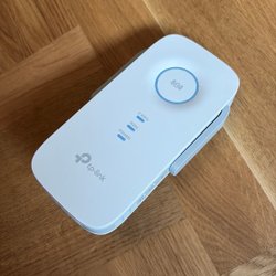 TP-Link 300Mbps Wifi Range Extender med AC Pass-Through. Modell: TL-WA860RE. Har en Ethernet port.