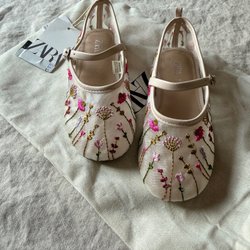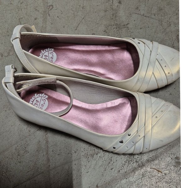 Snygga beige ballerinaskor från Marmelata med dekorativa remmar och små silverfärgade nitar framtill. Skorna har en rundad tå och en justerbar rem runt hälen. Insidan är fodrad med ljusrosa tyg för extra komfort. Finns fläck.