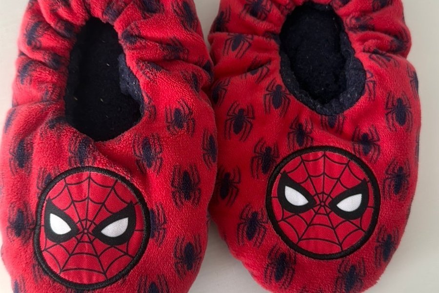 Ett par röda tofflor med spindelmannen-motiv. Tofflorna har en mjuk insida och är dekorerade med spindlar över hela ytan.
