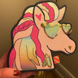 Söt, ljusrosa väska med fransar och flätad axelrem. På väskan står det ”Happy and Bright”.