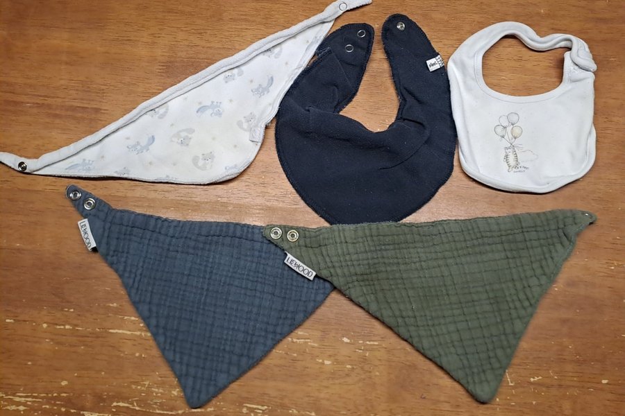 Här är ett set med fem haklappar i olika utföranden. Två stycken är frän Liewood