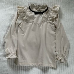 Ärmlös vit blus/tunika med spetsvolang vid axlarna och en knapp bak vid nacken. Från Newbie i storlek 86. Är i mycket fint använt skick.