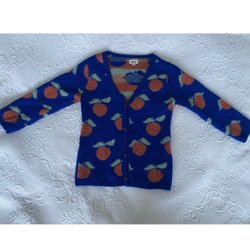 Blå stickad kofta med broderad bil på framsidan och knappar.
