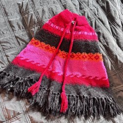 Grå poncho med fransar nedtill och en liten krage. Ponchon har öppningar för armarna. Storlek 12/13 YEARS.