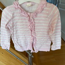 Vit kofta med långa ärmar och knappar framtill. Koftan har broderade blommor i rosa och rött samt en broderad kaninfigur på framsidan.
