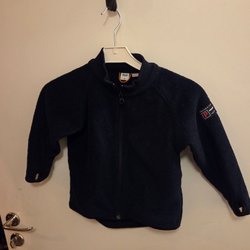 Mörkblå fleecejacka med dragkedja framtill och en ficka. Jackan har en liten logga på armen och en större logga på baksidan.