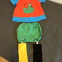 Ett par rosa byxor med dragsko i midjan och söta ugglor på knäna. Ett par blå jeans. Fint begagnat skick.