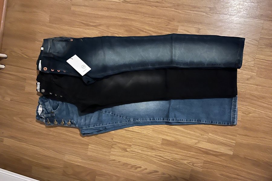 Säljer tre par jeans i olika nyanser av blått och svart. Byxorna har detaljer som knappar i gylfen. Storlek 146. Kommer från djur och rökfritt hem. Köparen betalar frakten. Jag ansvarar ej för skickade paket.