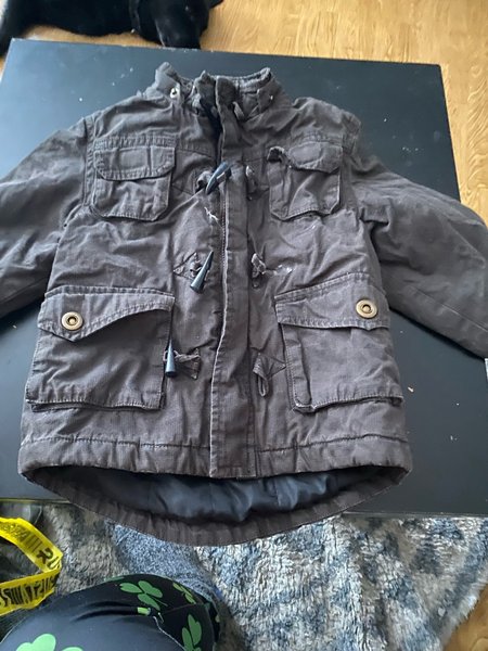 Brun jacka med många fickor framtill och knäppning med dragkedja och toggles.