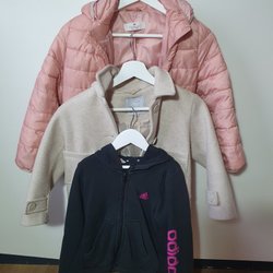 En brun teddyjacka med dragkedja och fickor, storlek 130. En mönstrad jacka, vind och regnjacka med huva, dragkedja och fickor storlek 134