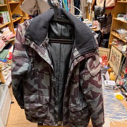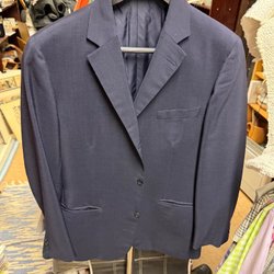 Mörkblå jacka med huva. Jackan har dragkedja och knappar framtill.