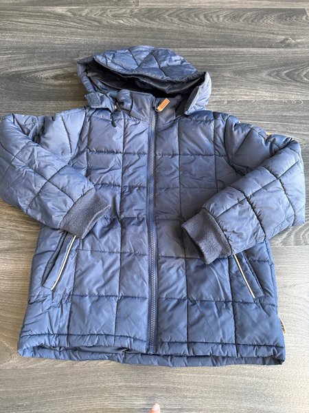 Blå vadderad Ebbe jacka med huva. Jackan har dragkedja fram och muddar vid ärmslut. Fickor fram med vita detaljer.