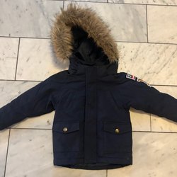 Marinblå jacka med huva och fuskpäls. Jackan har två fickor nedtill och en bröstficka med dragkedja.