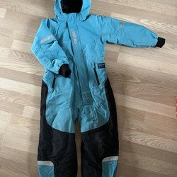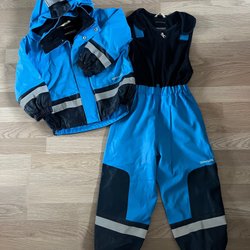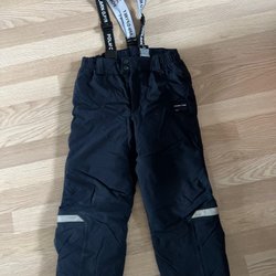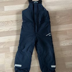Ett par blå skidbyxor från Polarn O. Pyret med justerbara hängslen och resår i midjan. Byxorna har reflexer nedtill på benen och justerbara fothällor. Mycket fint skick! Namnade