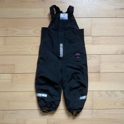 Svarta överdragsbyxor med hängslen och reflexer nedtill. Byxorna har förstärkta partier på knäna och bensluten.