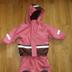 Ett set med en grön jacka och svarta byxor. Jackan har en huva, dragkedja fram och reflexdetaljer. Byxorna har resår i midjan, reflexdetaljer och fothällor.
