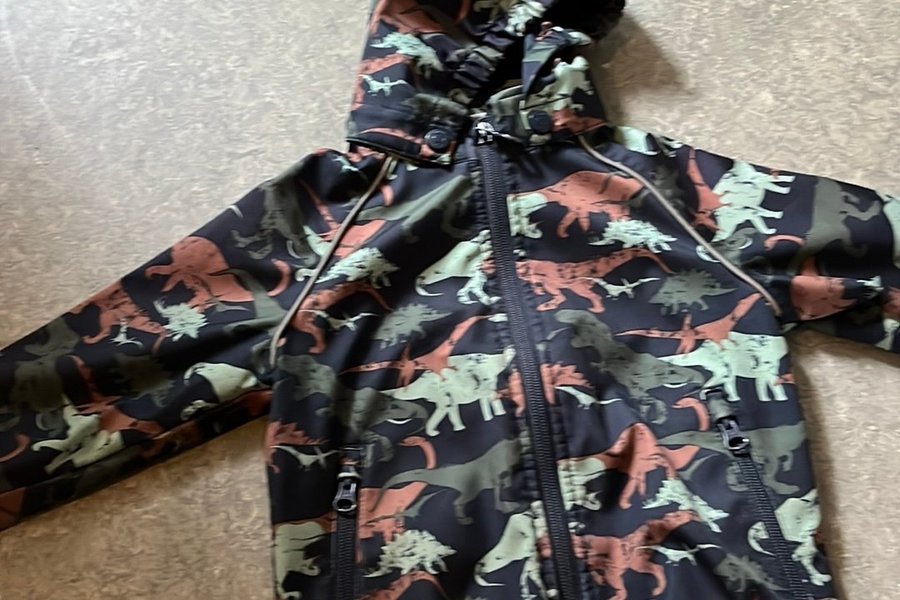 En jacka med huva och dragkedja framtill. Jackan har ett mönster med dinosaurier i olika färger. Det finns två fickor med dragkedja framtill.