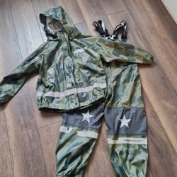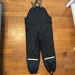 Svarta regnbyxor med hängslen och reflexdetaljer nedtill på benen. Byxorna har resår nedtill.