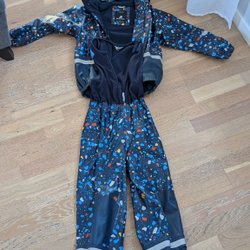 Fint regnställ i tre färger. Jackan har en huva och byxorna har justerbar resår i midjan och fothällor.