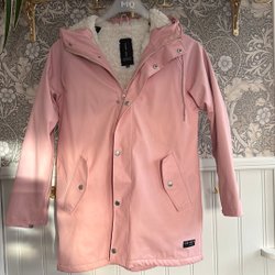 Rosa regnjacka med huva och tryckknappar. Jackan har två fickor
