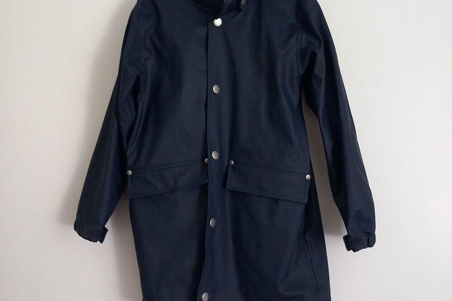 Marinblå regn kappa med huva. Jackan har silverfärgade tryckknappar framtill och två fickor med lock.