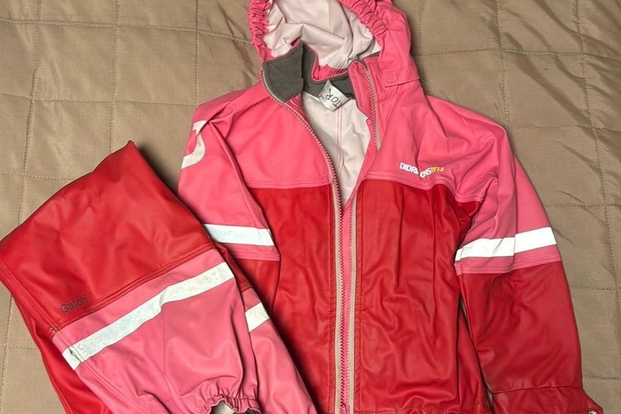Ett set med regnkläder från Didrikson. Setet består av en jacka och ett par byxor. Jackan är i två nyanser av rosa och röd med reflexer. Byxorna är i rött och rosa med reflexer och hängslen.
