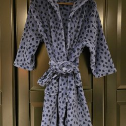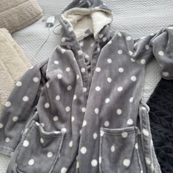 Julklapp/present!!!!! Rosa med vita prickar, huva, knäppning fickor och knytband i midjan. Knytband är fast i rocken ej avtagbart. Från Kappahl i mycket fint skick