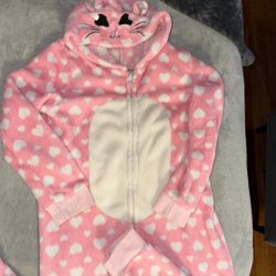 Rosa badrock med huva och vita stjärnor. Badrocken har ett knyte i midjan och två fickor fram. Lite fläckar finns, se tredje bilden.